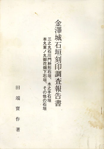 「近世城郭の石垣には、殆んどと申してよい程助役大名とその家臣と思われる家紋・相紋・裏紋等が多かれ少なかれ石垣に刻まれている。その主なものは天下普請である。江戸城・駿府城・名古屋城・篠山城・大坂城等から多数の刻印が検出されていることは周知の事実である。外様大名中最高の石高をもって任ずる金澤城主前田家及びその諸子団のものと思われる刻印がもっとも多く、種類も豊富であることが助役を命ぜられた駿府城修築・名古屋城修築・大坂城修築・名古屋城修築・江戸城修築石垣石材産調査の結果、静岡県伊豆半島東海岸各石丁場等にみられる。したがいまして、その刻印照合の目的を以って金澤城石垣刻印調査を金澤大学当局のご指導のもとに同好の士と共に、第1次調査を昭和50年に五日間、第2次調査を同年に七日間、短期間ほんの一部分を見て全體を知ることは困難でありますが、その傾向をつかめたことは確認をもってご報告できるものと信じます。」