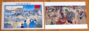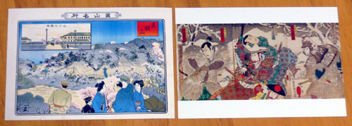 富山城址公園にある富山市郷土博物館で購入できます。上段の桜の郷土博物館は5枚セットで250円。下段の左、桜の郷土博物館と利常の鯰兜はバラ売りで各50円です。窓口で展示に関するアンケートを記入すると、右の2枚を含めた絵葉書を1枚もらえます。2006年春にリニューアルした郷土資料館は壁も真っ白で堀の水と桜がよく映えます。